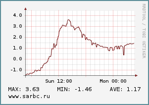 Дует юго-западный ветер 6 м/с, который во второй половине дня усилится до 8-9 м/с, с порывами до 18-20 м/с. Атмосферное давление понизится с 756 до 745 мм рт.ст.