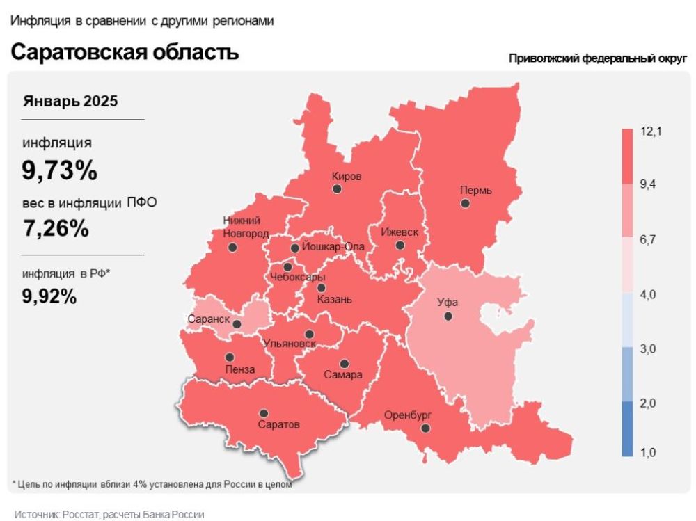 По данным Банка России, в прошлом месяце инфляция в регионе выросла и составила 9,73% после 9,2 в декабре (в Приволжском федеральном округе - 9,97, по РФ - 9,92%).