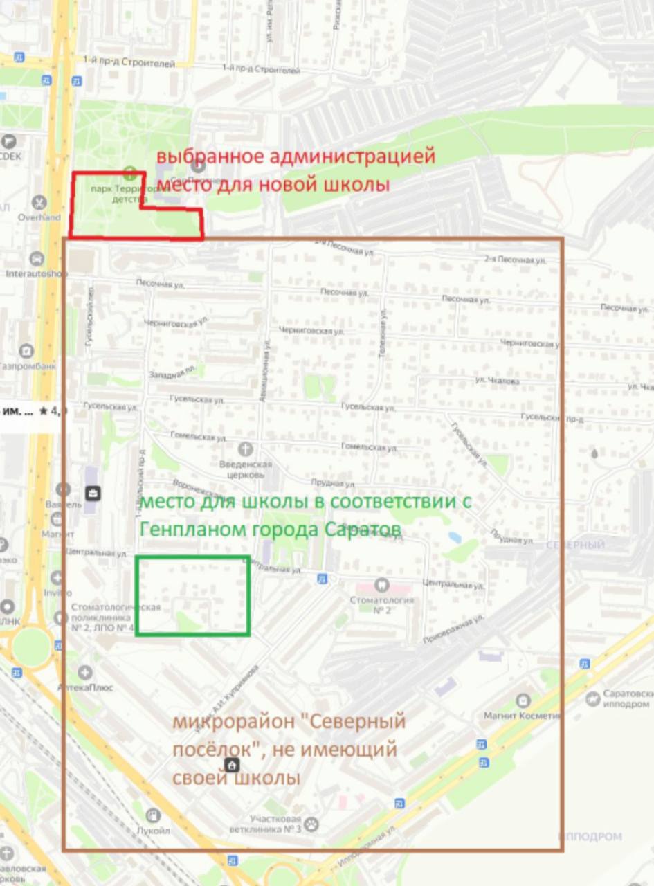 В то же время в Телеграм-канале "Говорит Саратов" появился пост о том, что в генплане от 2022 года в микрорайоне "Северный поселок" отдельно выделен участок под школу (см. фотогалерею). Он находится на отдалении от парка "Территория детства" и застроен частными домами