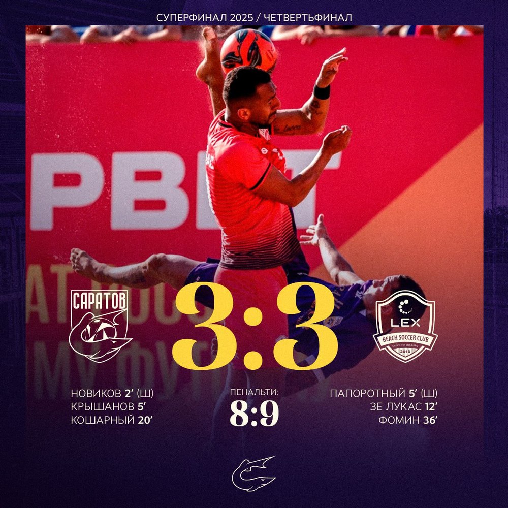 Основное время команды завершили с равным счетом - 3:3. У саратовцев забили Новиков, Крышанов и Кошарный. В овертайме зрители голов не увидели, поэтому дело дошло до серии пенальти. Там сильнее был "Лекс" - 9:8.