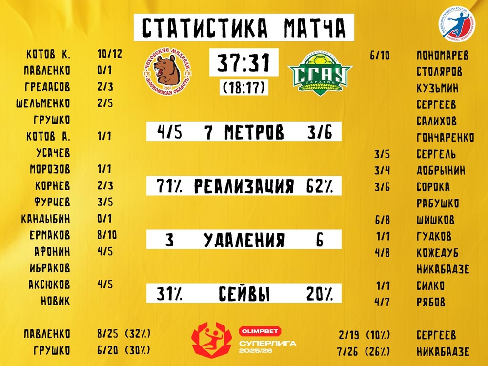 Матч в Подмосковье завершился со счётом 37:31 (18:17) в пользу хозяев.