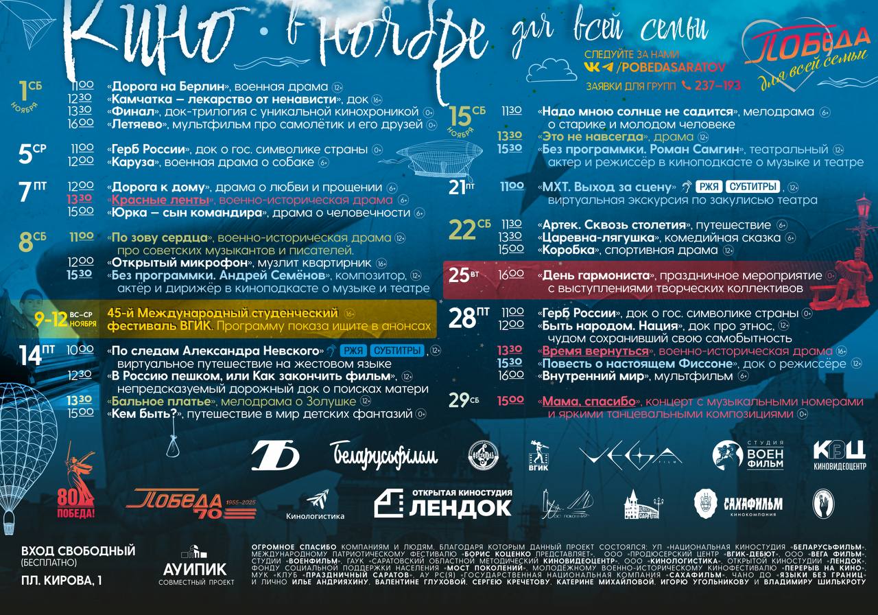 В Саратове кинотеатр "Победа" бесплатно покажет в ноябре фильмы и мульфильмы.