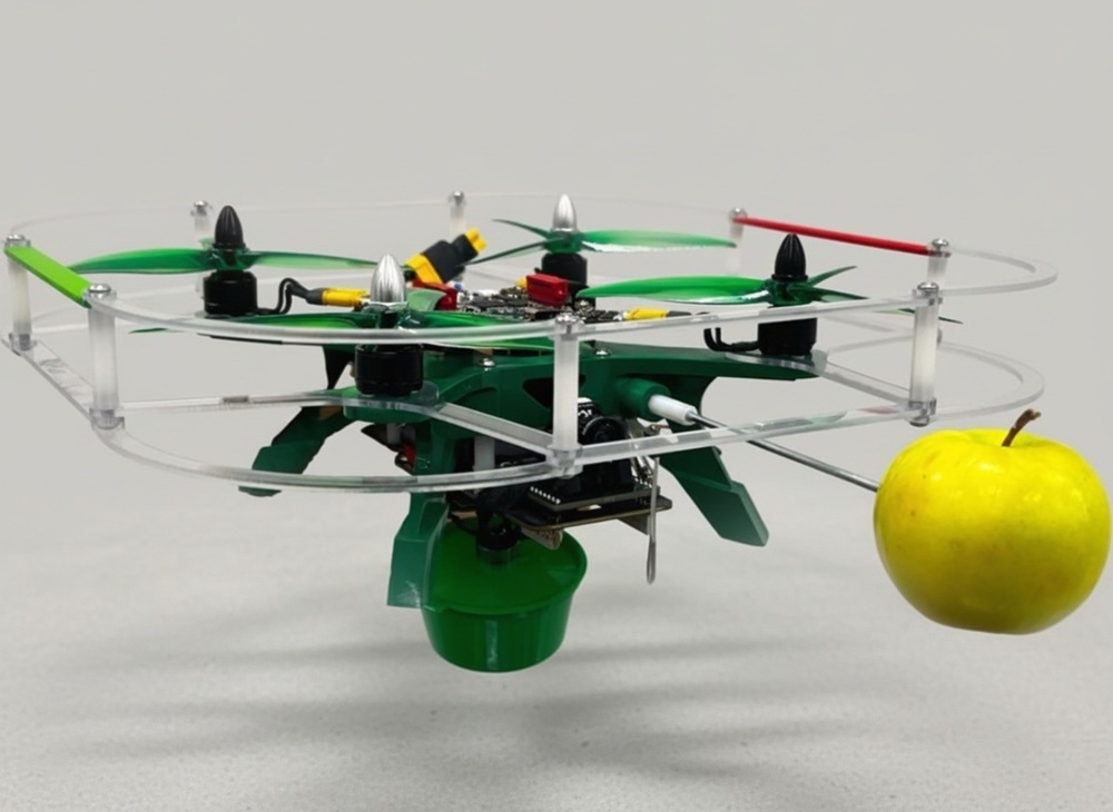 Беспилотник способен работать в труднодоступных зонах плодовых деревьев. Он может доставлять малогабаритные удобрения и снимать плоды специальной модульной иглой.