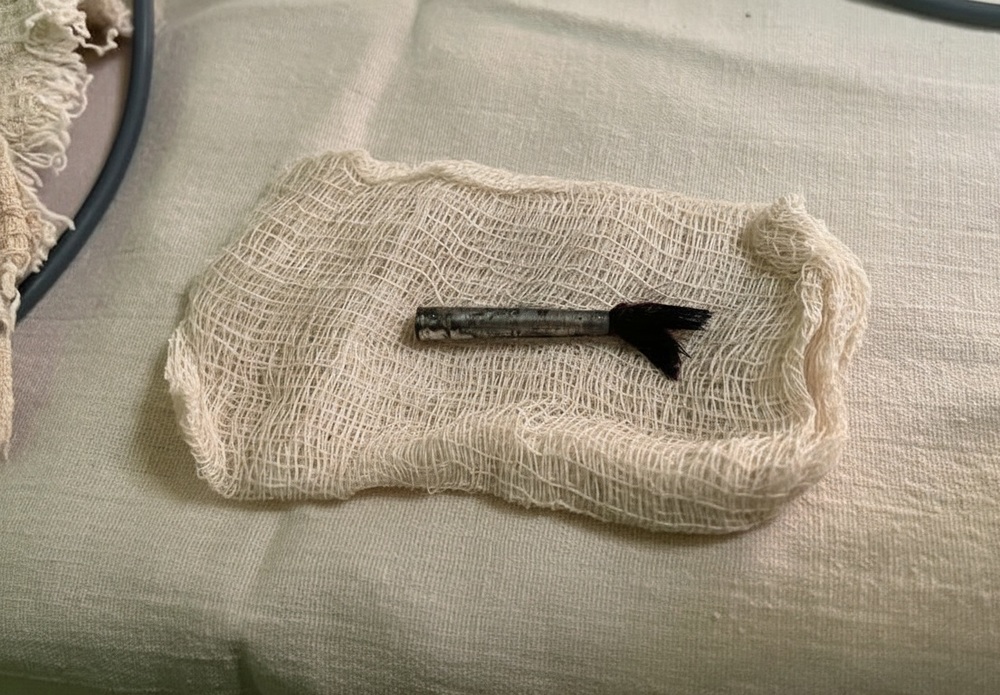 Во время рисования дома ребёнок взяла кисточку в рот и наткнулась на неё. Железный наконечник отломился и прошёл в мягкие ткани щеки. Пострадавшая поступила к оториноларингологам с высокой температурой и гнойным свищом в челюсти. Врачи рассказали, что рядом с инородным телом находилась сонная артерия, и жизни ребёнка угрожала реальная опасность.