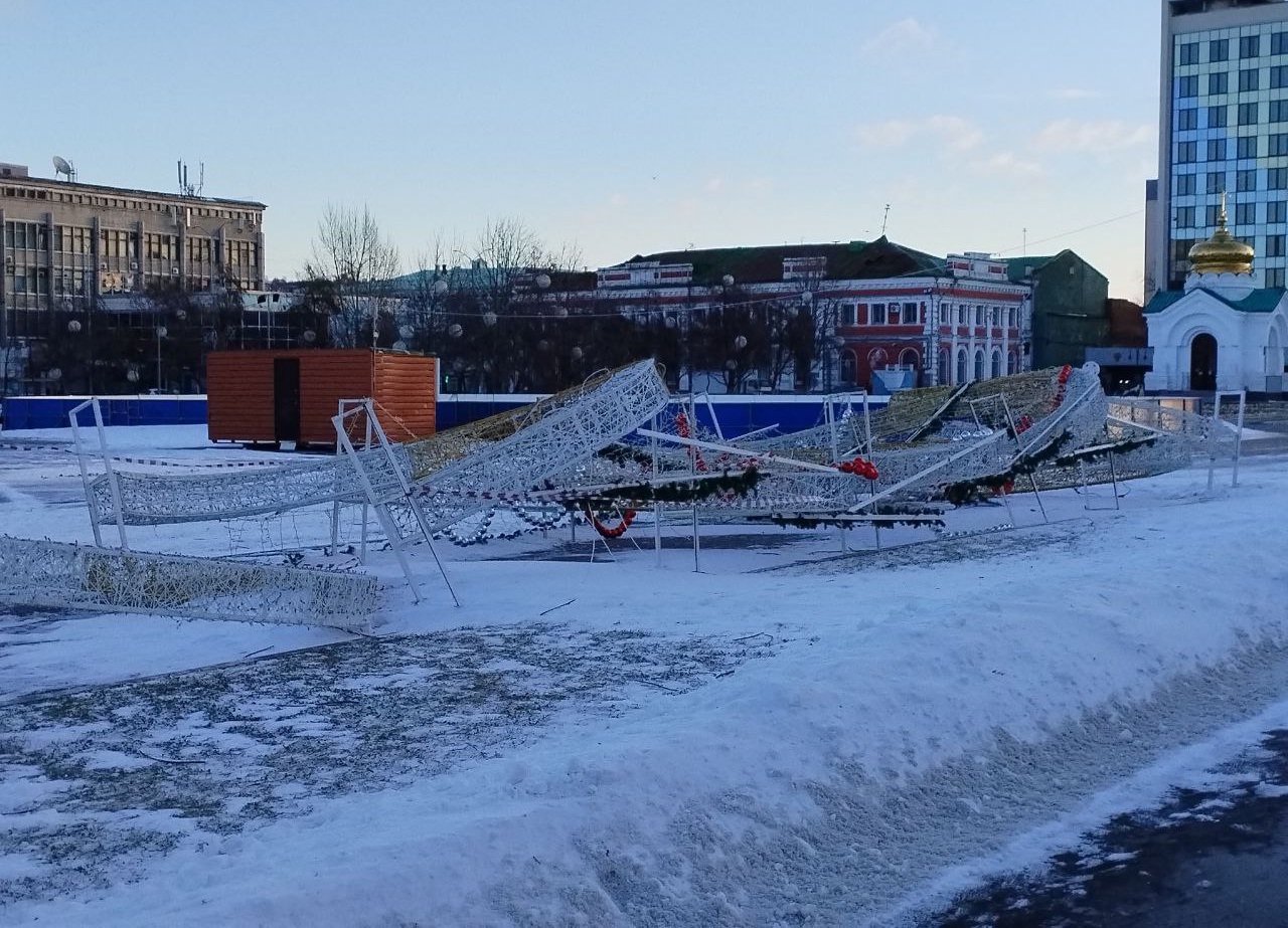 Вечером 13 декабря сильный ветер сломал пополам главную новогоднюю ёлку на Театральной площади.