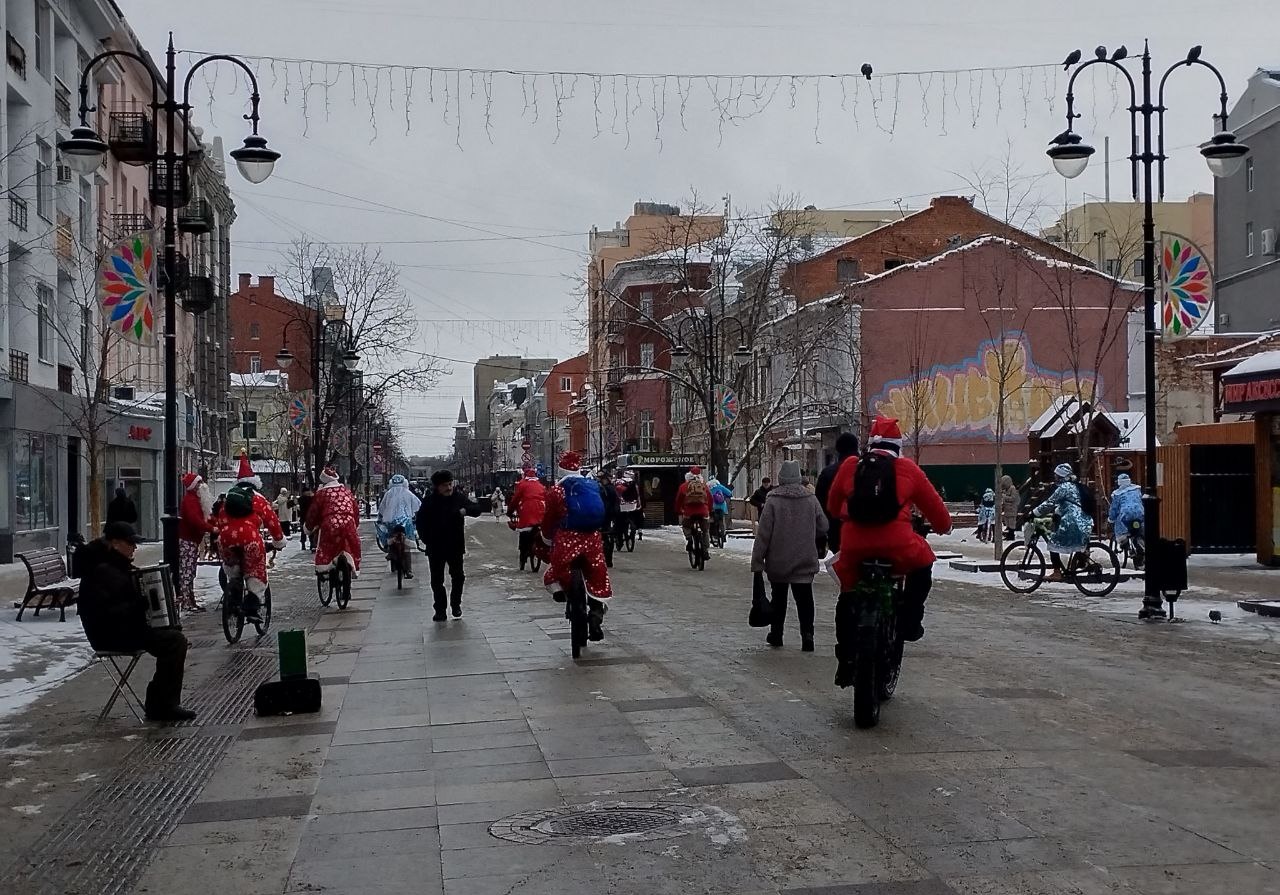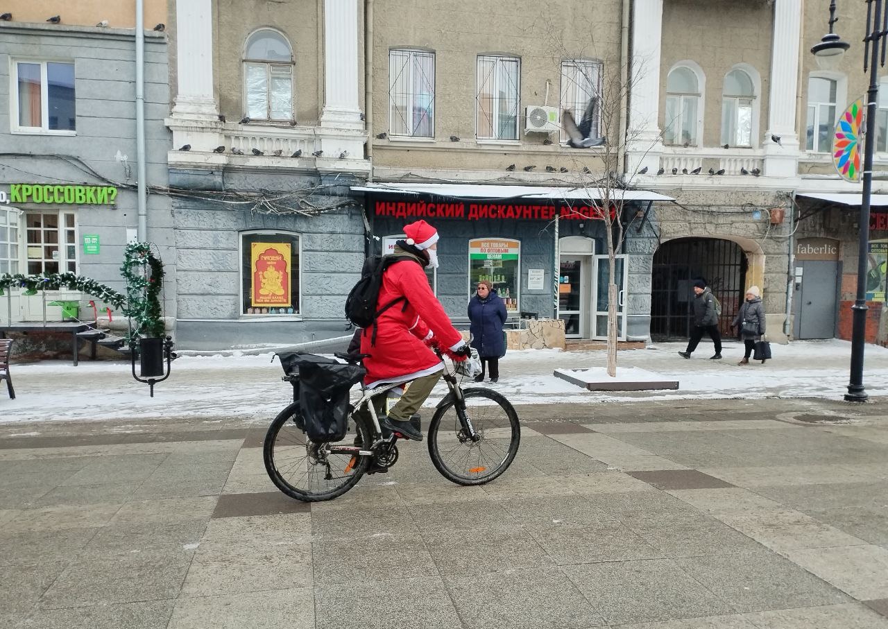 Сегодня в Саратове прошла предновогодняя акция "Велодедмороженое". Около двадцати участников в костюмах Дедов Морозов и Снегурочек проехали на велосипедах по проспекту Столыпина и другим центральным улицам.