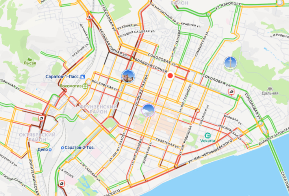 По данным сервиса "Яндекс", в бордовый цвет окрашены центральные улицы - Рахова, Большая Горная, Астраханская, Рабочая и др., а также Дегтярная, Чернышевского, 50 лет Октября. Сложно проехать по Московской, Чапаева, Мичурина, Шехурдина, Строителей. Затруднён подъезд к развязке на "Стрелке", кольца под мостом на 3-й Дачной и у СНИИМ и поворот на Техническую.