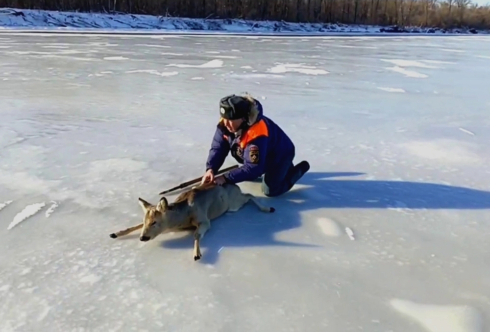 Во время профилактического рейда инспекторы заметили косулю, которая выбралась на открытое ледяное пространство и стала абсолютно беспомощной. При любой попытке подняться или сдвинуться с места копыта животного разъезжались в разные стороны.