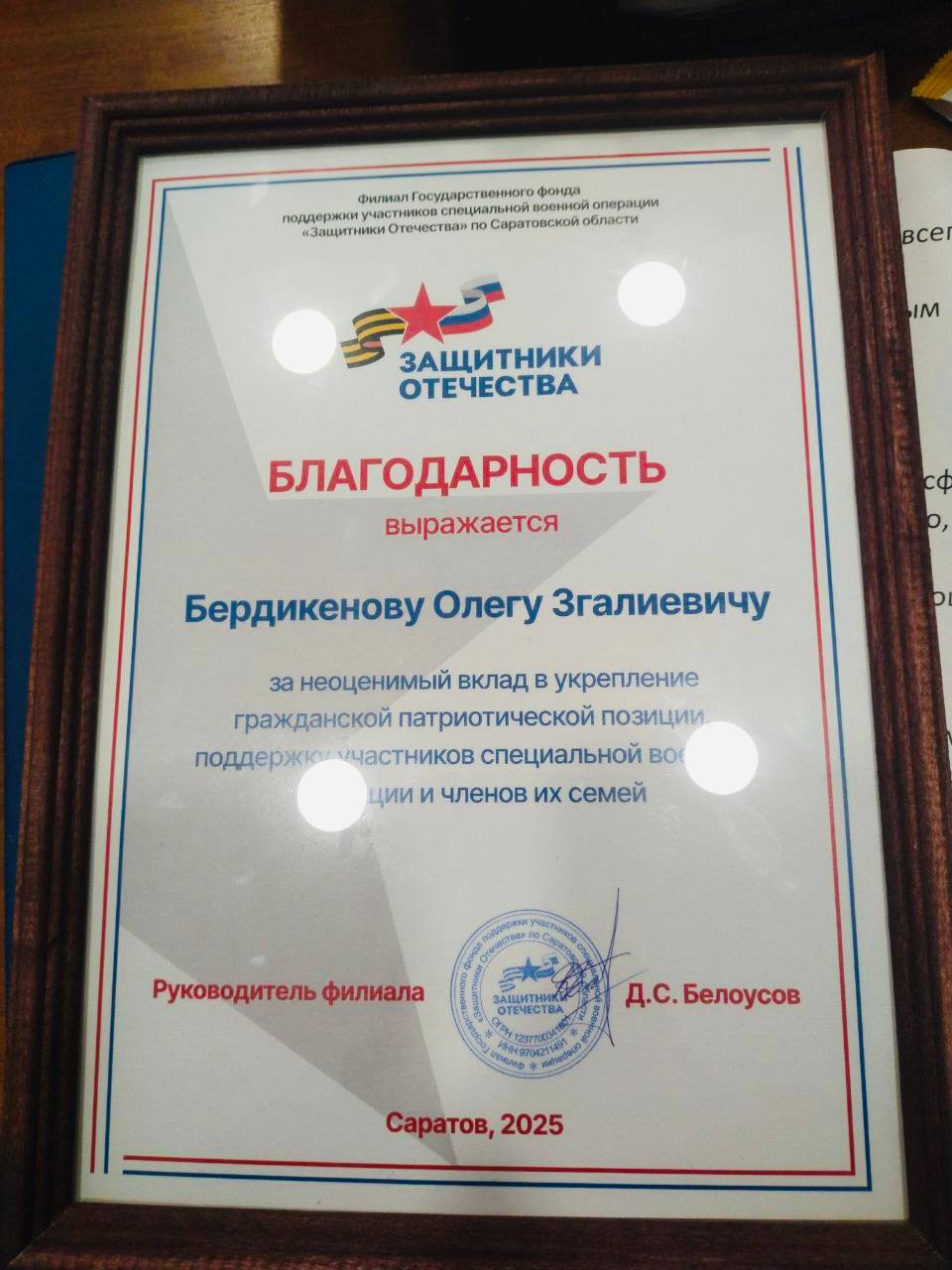 Саратовский торгово-ярморочный комплекс "Привоз" отмечен благодарностью фонда "Защитники Отечества".