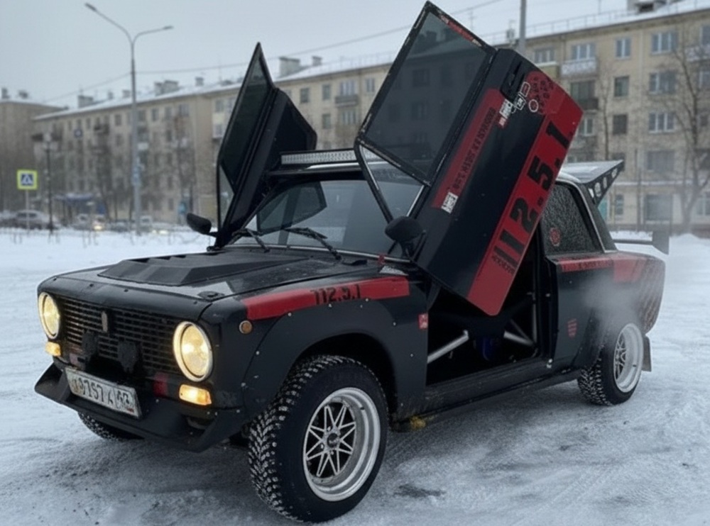 Судя по объявлению на одном из профильных сайтов, от классической "копейки" 1980 года выпуска здесь остался только кузов. Машина настроена под заезды по снегу или мокрому асфальту. Задние двери заварены, а передние открываются вверх в стиле Lamborghini.