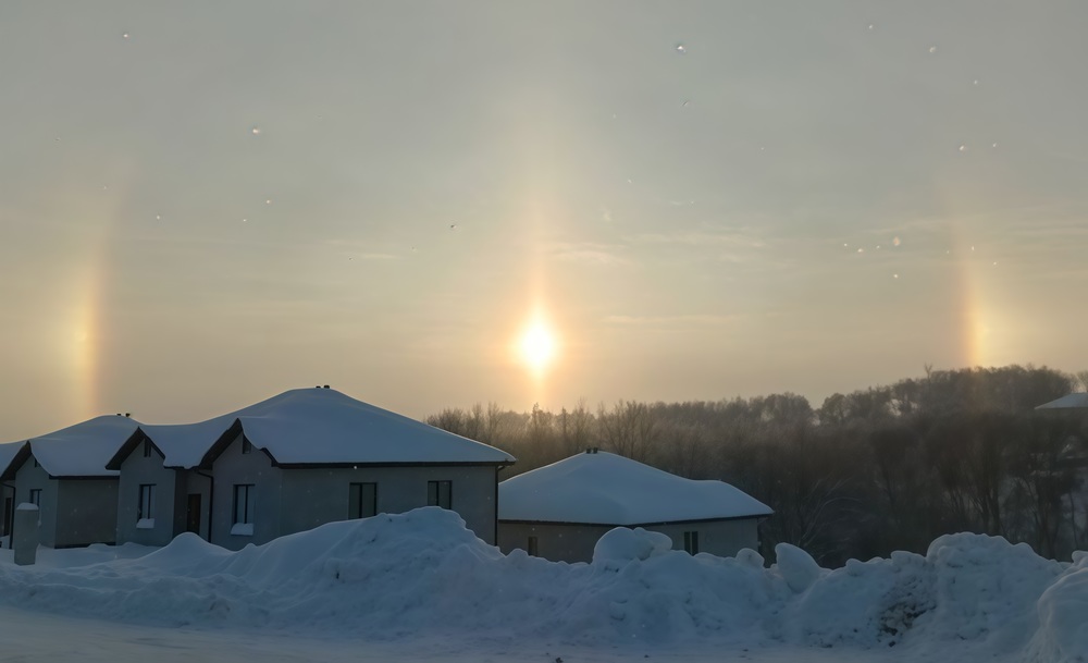 Саратовцы смогли увидеть паргелии, которые также называют "ложными солнцами". Это наиболее яркие элементы гало, которые выглядят как два симметричных световых пятна по бокам от настоящего светила. Обычно они располагаются на уровне солнечного диска и возникают при определённом положении ледяных шестигранных пластинок в воздухе. Морозная погода и наличие влаги в верхних слоях тропосферы сегодня создали идеальные условия для этого оптического эффекта.