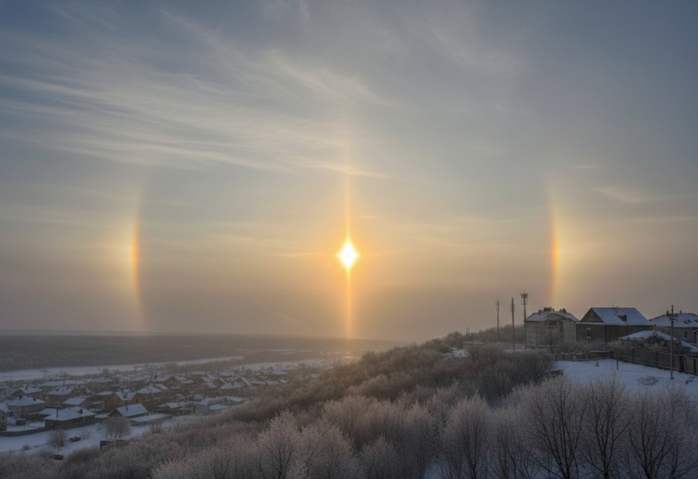 Помимо светящегося кольца, горожане увидели паргелии, известные как "ложные солнца". Эти яркие радужные пятна по бокам от светила появились из-за горизонтальной ориентации плоских шестиугольных ледяных пластинок в воздухе.