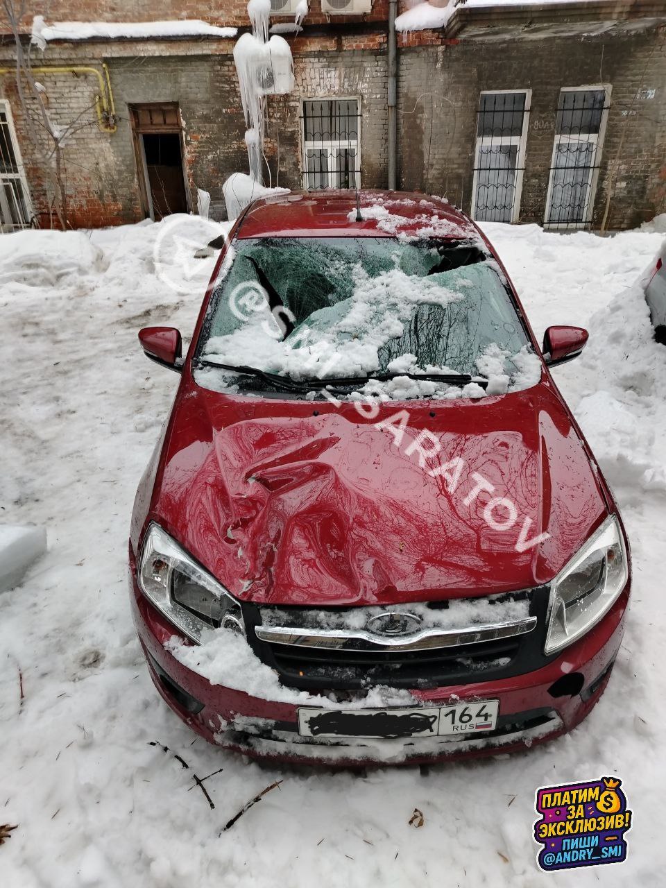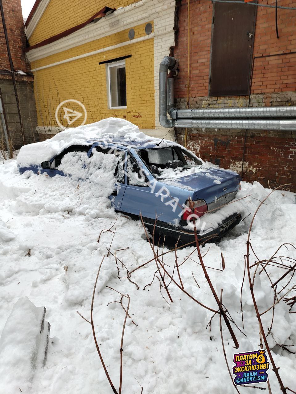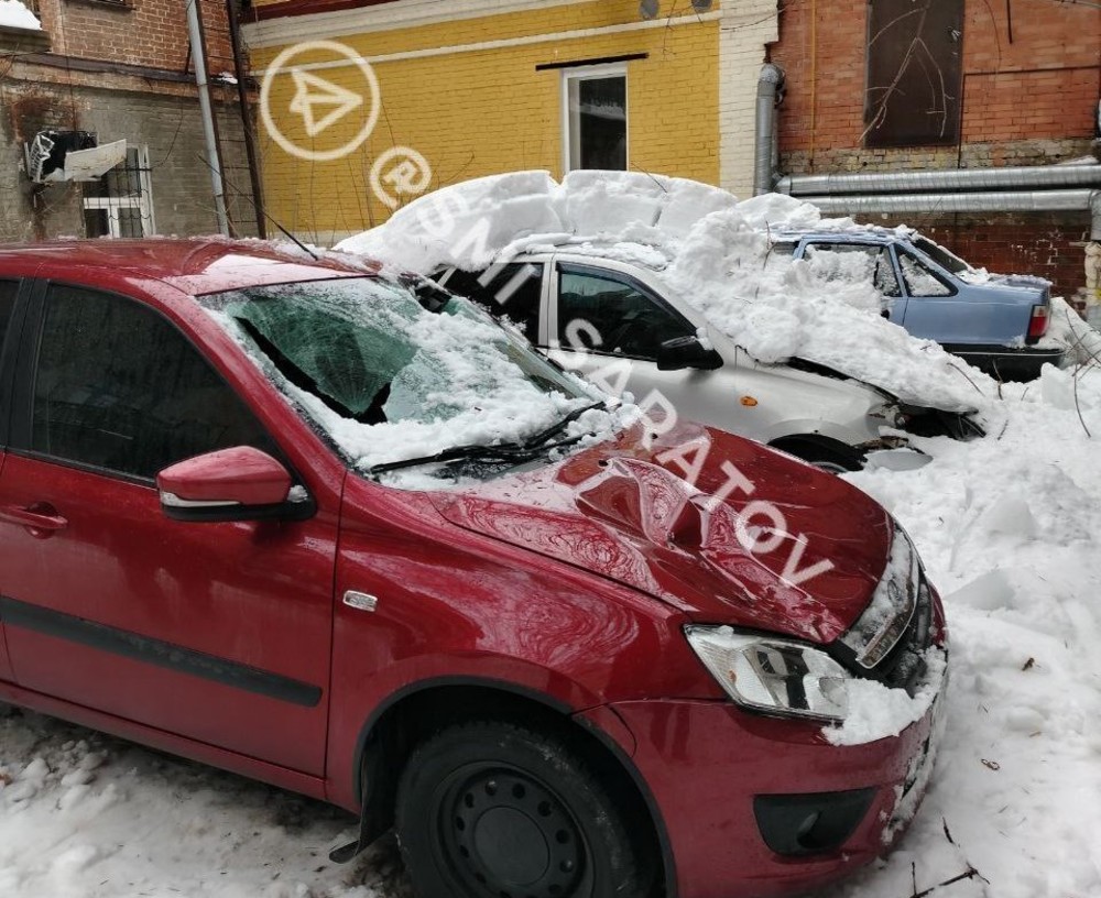 В центре Саратове упавший с кровли снег повредил три припаркованных автомобиля.