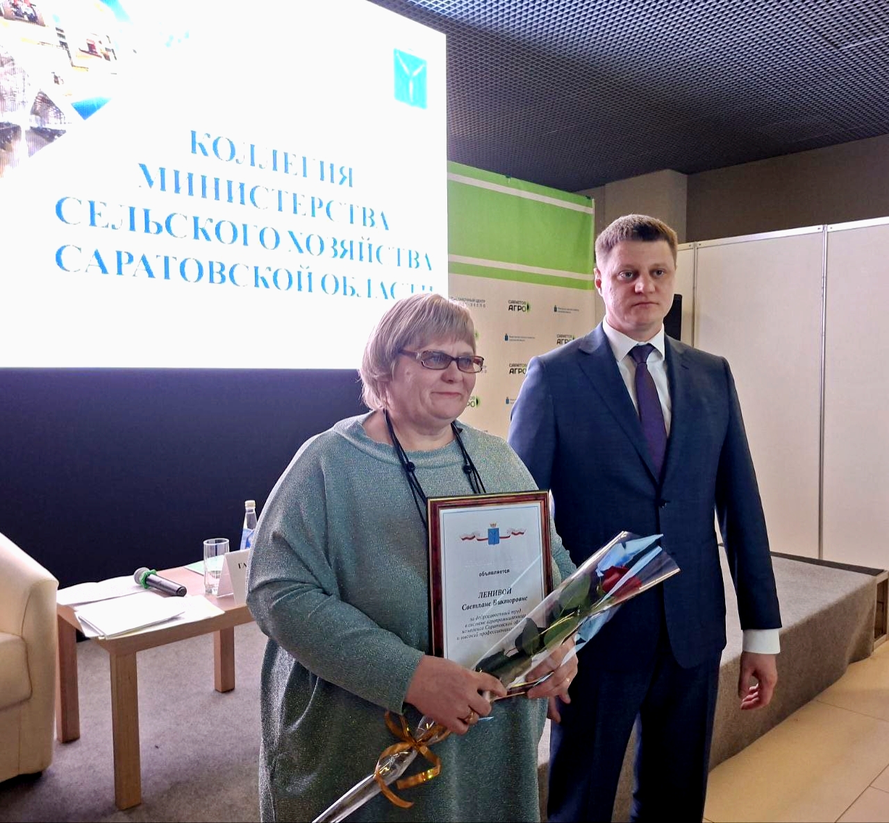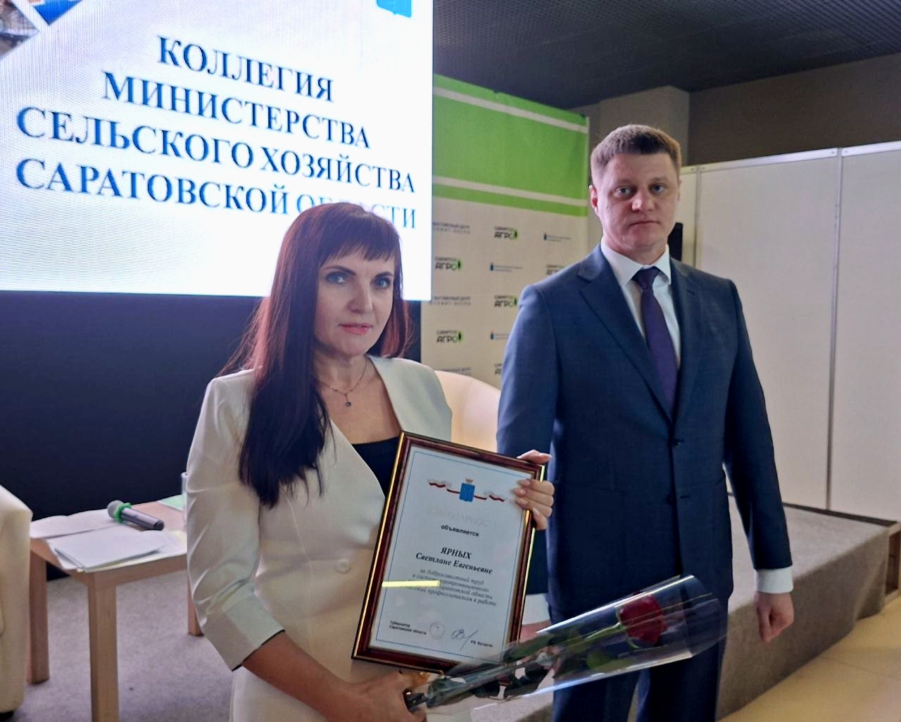 Состоялось награждение лучших работников отрасли, внесших существенный вклад в развитие сельского хозяйства и перерабатывающей промышленности. Руководитель аграрного блока региона Василий Котов вручил благодарности губернатора сотрудникам Группы компаний "Белая Долина" - директору по производству мороженого Светлане Ярных и начальнику производства N2 Светлане Ленивой.