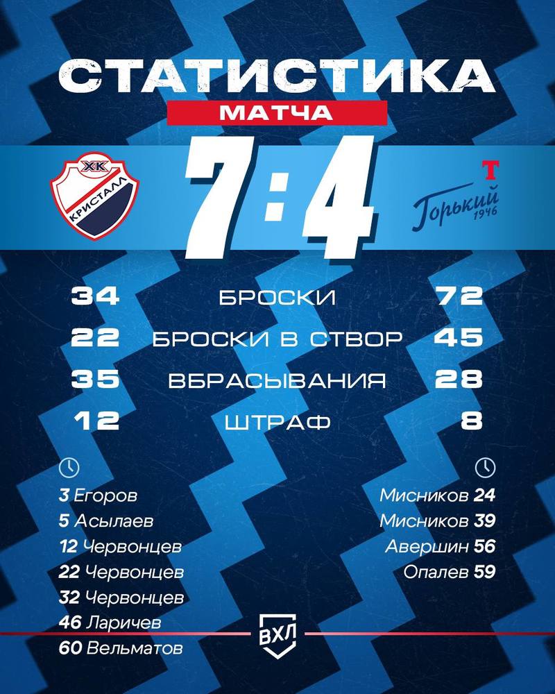 Хозяева уверенно выиграли, разгромив нижегородцев - 7:4. Хет-триком отметился Никита Червонцев. По одной шайбе забросили Егор Егоров, Никита Асылаев, Иван Ларичев, Александр Вельматов.