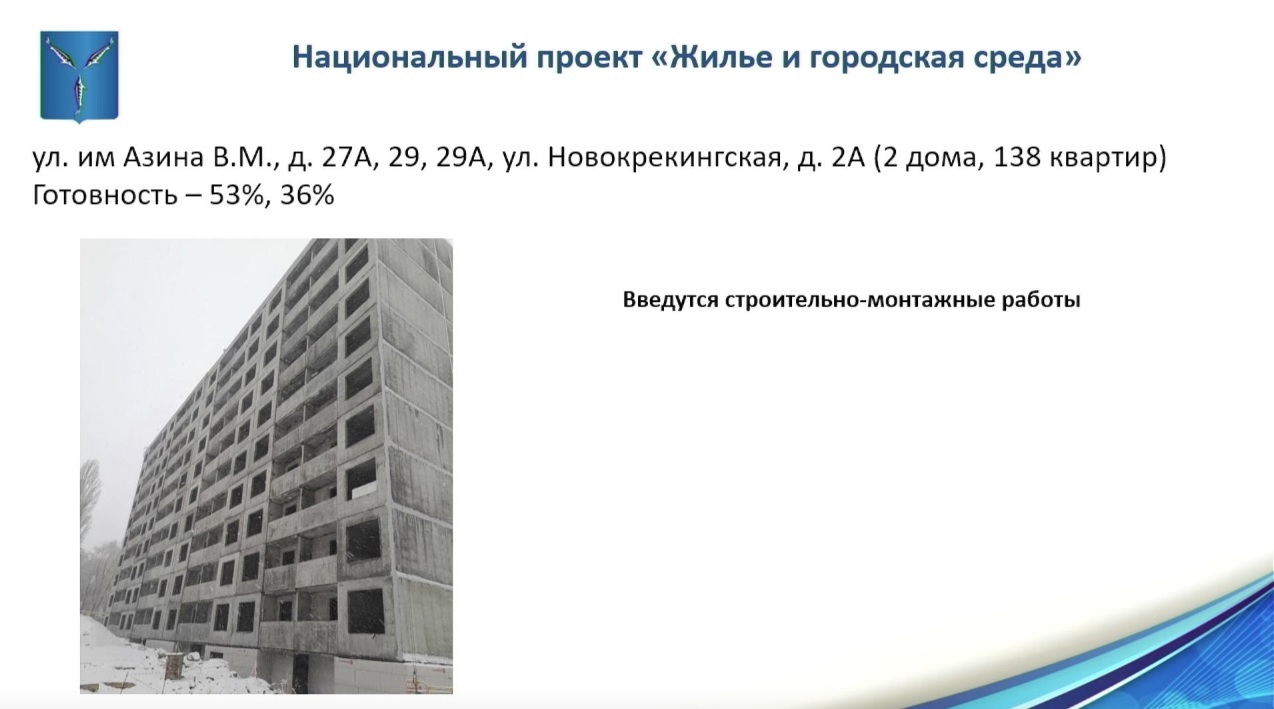 Речь идёт о панельных многоэтажках, которые возводят на участках на Азина, 27А, 29, 29А, и Новокрекингской, 2А. Там строят два дома на 138 квартир. Их готовность составляет 53% и 36%.