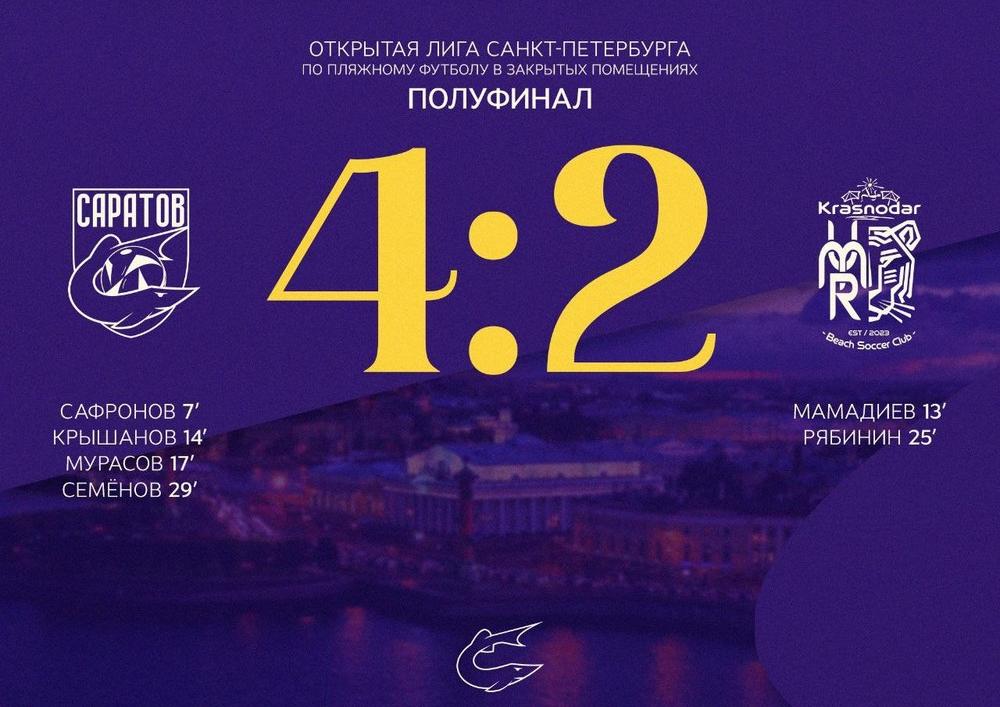 КПФ "Саратов" вышел в финал Открытого кубка Санкт-Петербурга по пляжному футболу в закрытых помещениях.