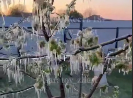 Телеграм-канал "Саратов Жесть 18+" обнародовал кадры с сосульками на молодых листьях и ветках плодовых деревьев в одном из дворов села Мелик Балашовского района.