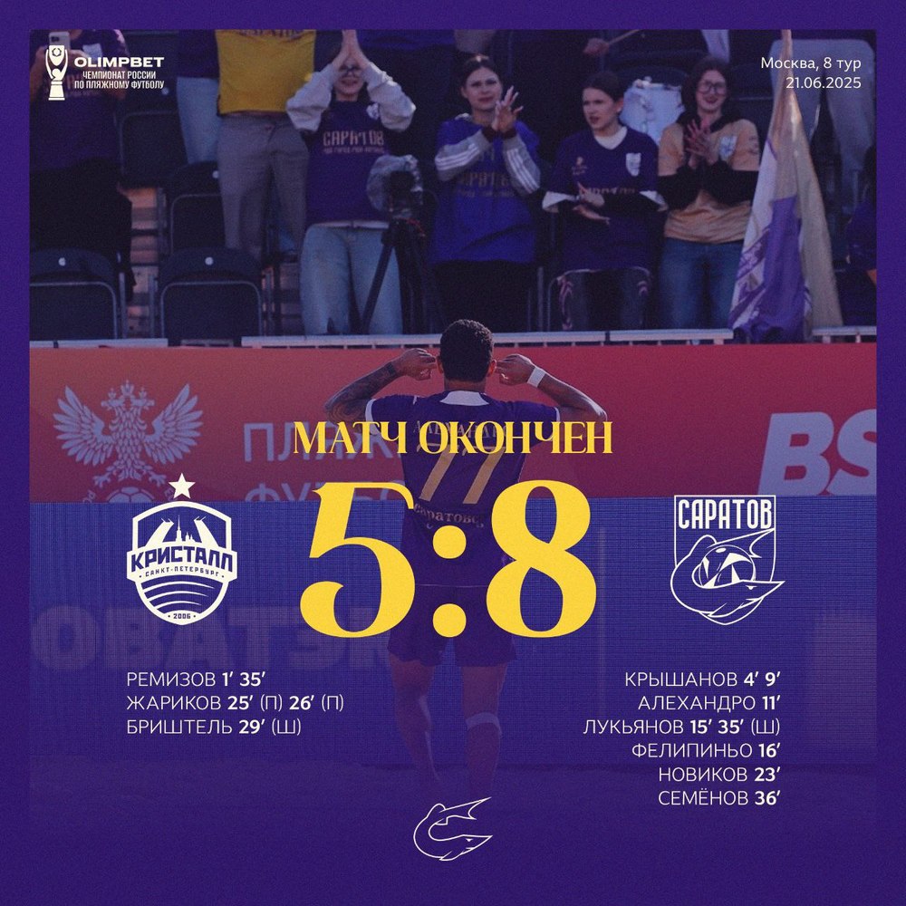 В Москве на 8 туре чемпионата России клуб по пляжному футболу "Саратов" одержал очередную победу. Со счетом 8:5 был обыгран петербургский "Кристалл".