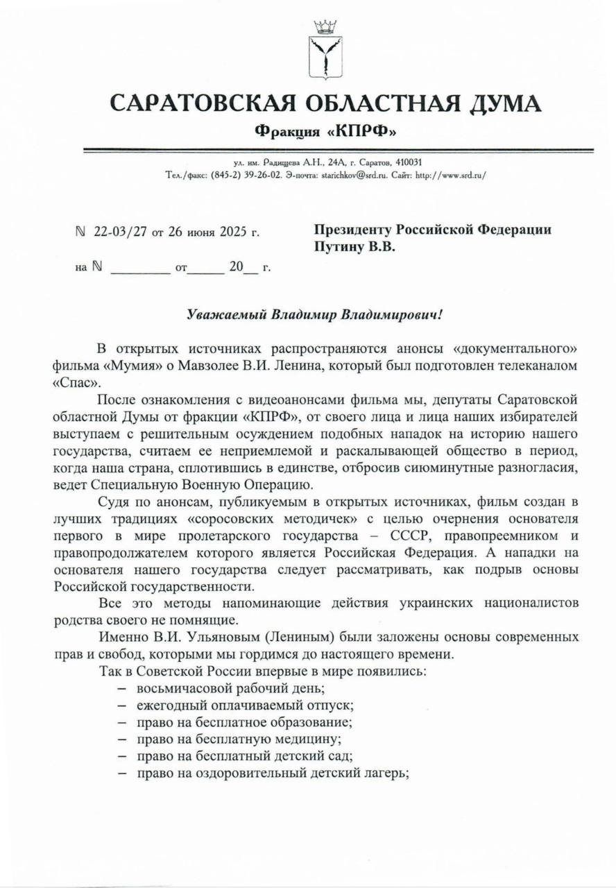 Депутат облдумы от КПРФ Денис Буланов в своём Телеграм-канале рассказал о появлении анонсов якобы, по его словам, документального фильма "Мумия" о мавзолее вождя пролетариата, подготовленного телеканалом "Спас". Следом в посте сообщается о поданном на имя президента Владимира Путина и главы РПЦ патриарха Кирилла обращении от Буланова и его коллег по фракции в регпарламенте.
