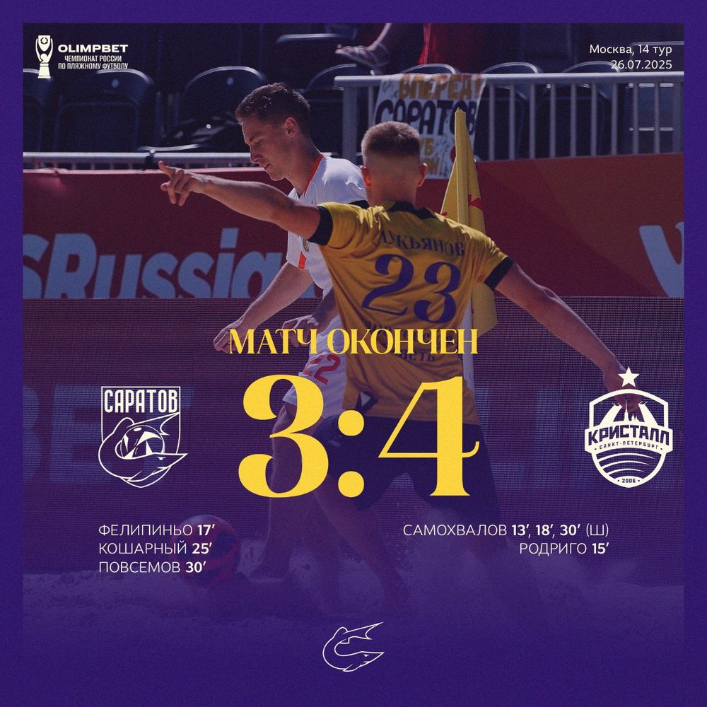 Саратовцы играли в "догонялки" с питерским "Кристаллом", однако в итоге уступили соперникам один мяч - 3:4. Голами отметились Фелипиньо, Кошарный, Повсемов.