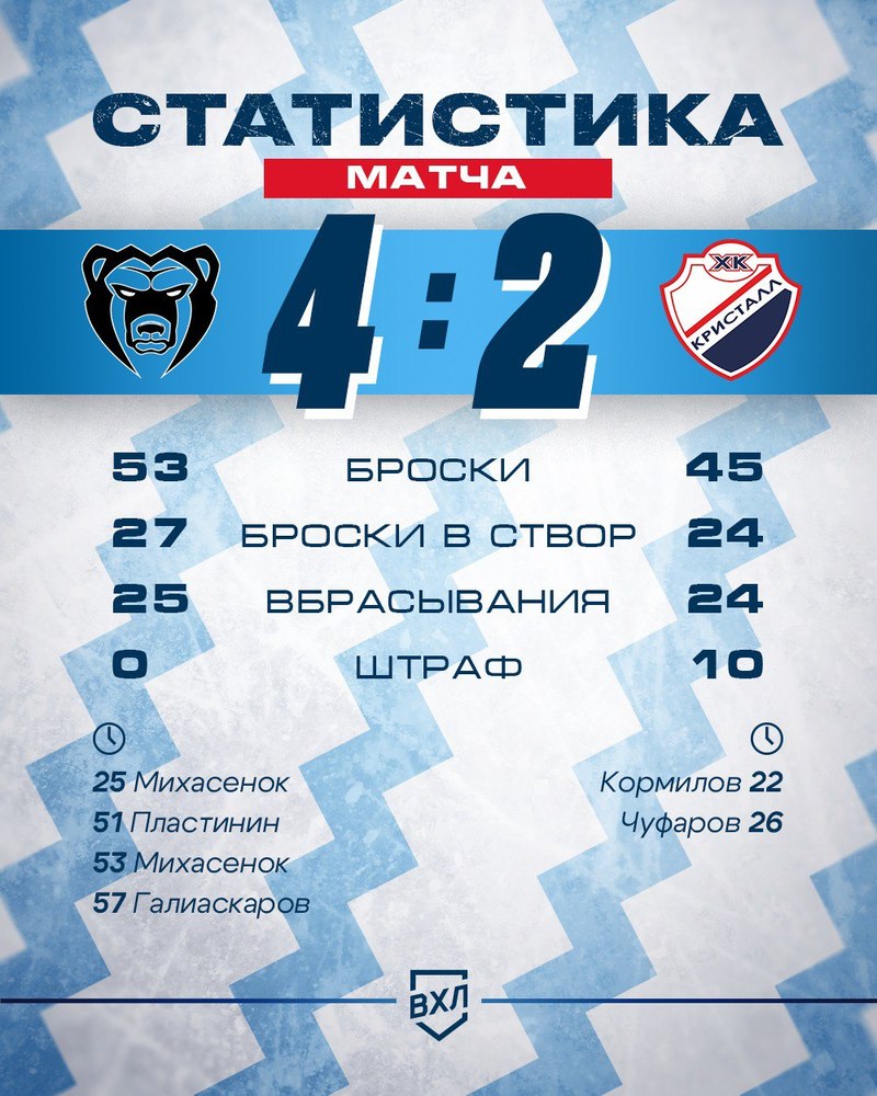 В очередном туре ВХЛ команда в Перми встречалась с местным "Молотом". "Кристалл" по ходу матча вел 2:1, однако в итоге уступил 2:4. Шайбы у гостей забросили Кормилов и Чуфаров.