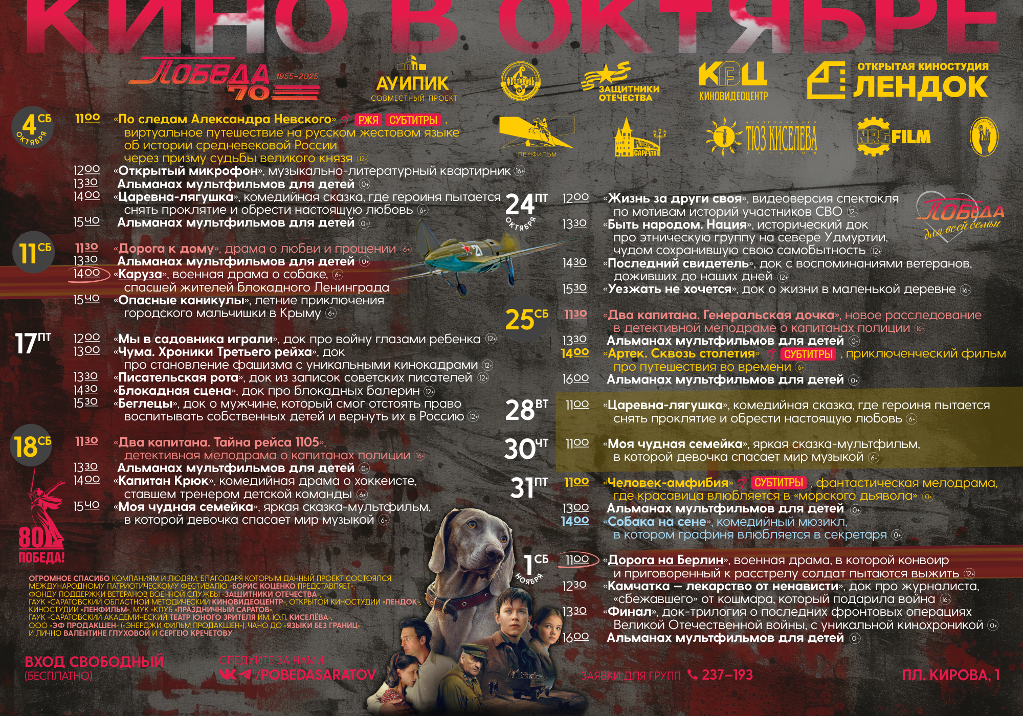 В Саратове кинотеатр "Победа" бесплатно покажет в октябре мультфильмы, военные драмы и документальное кино.