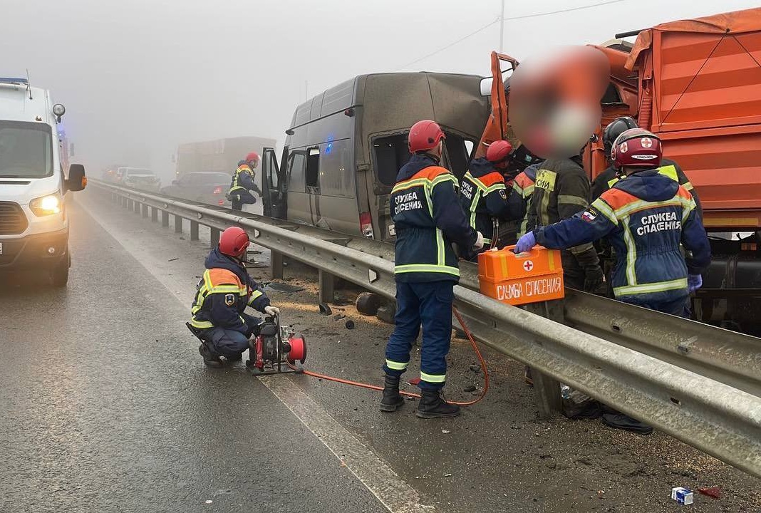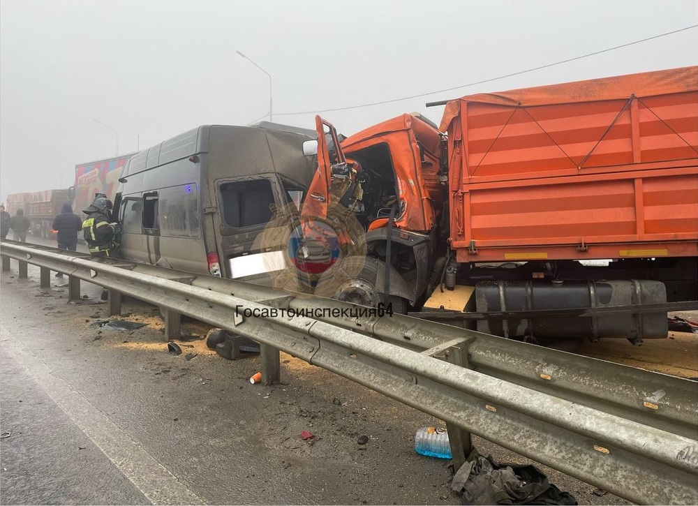 По данным Госавтоинспекции, в 9:10 в Гагаринском районе на трассе рядом с селом Еремеевка столкнулись три "КАМАЗа", автобус "Форд Транзит" и два легковых автомобиля - "Тойота" и "Вольво".