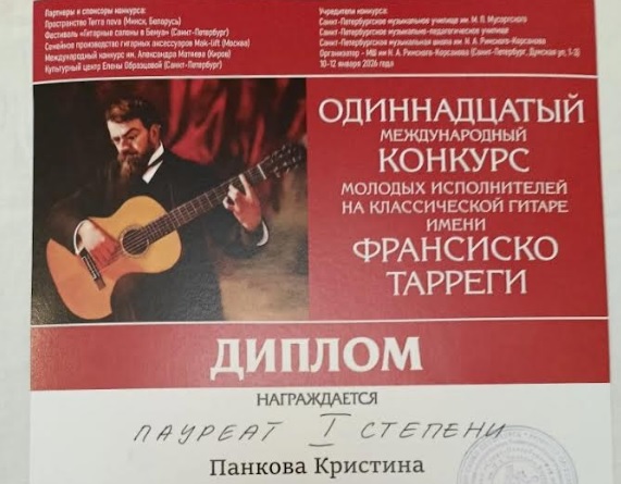 Кристина Панкова завоевала диплом Первой степени гитарного конкурса имени Тарреги в Санкт-Петербурге.